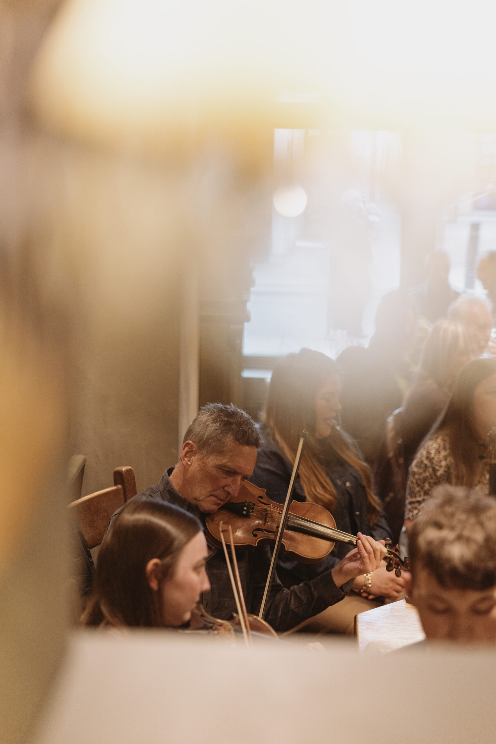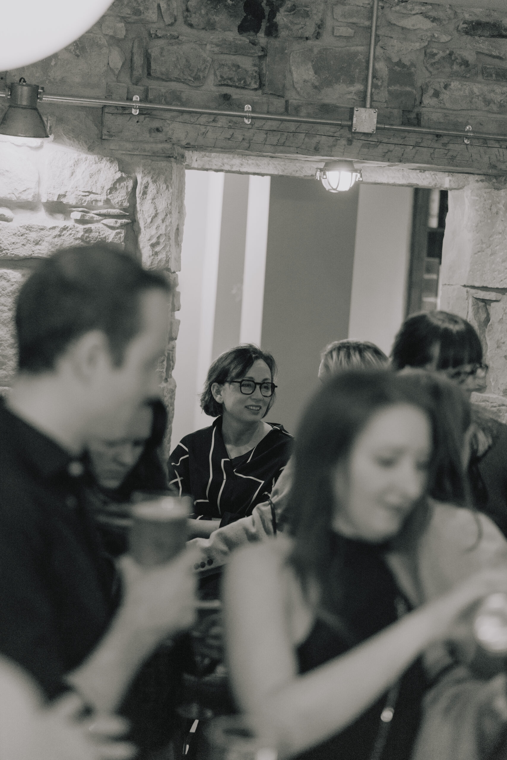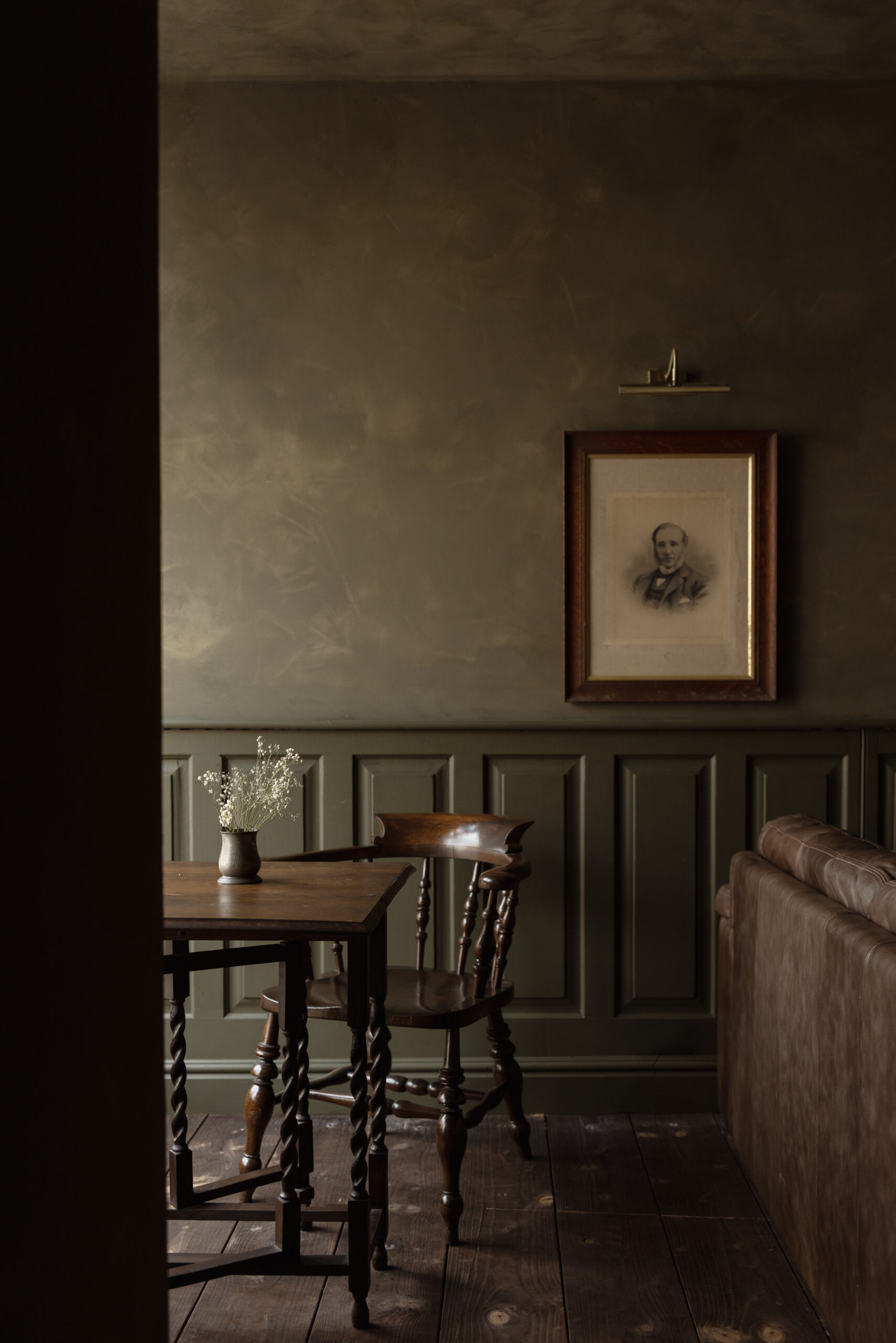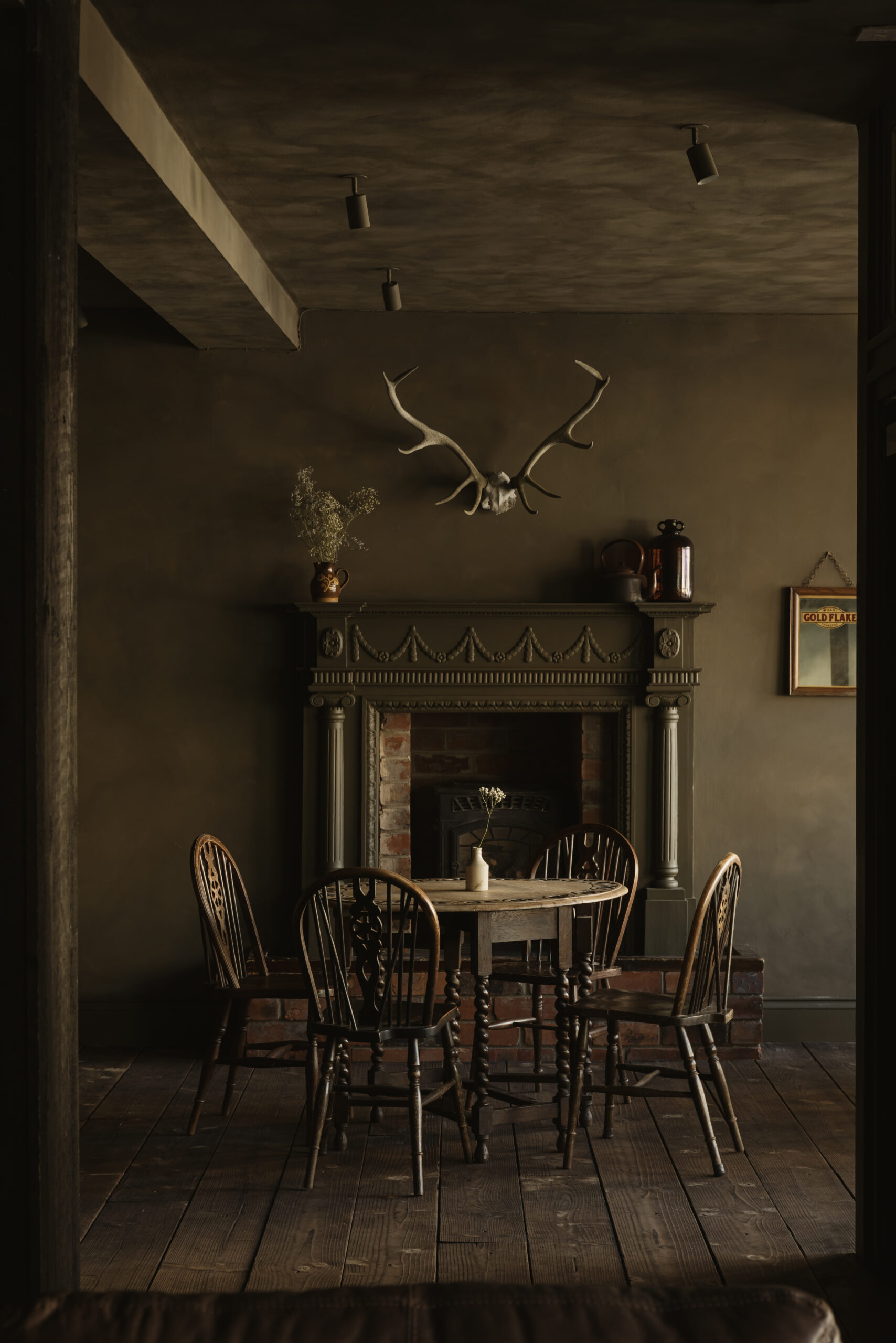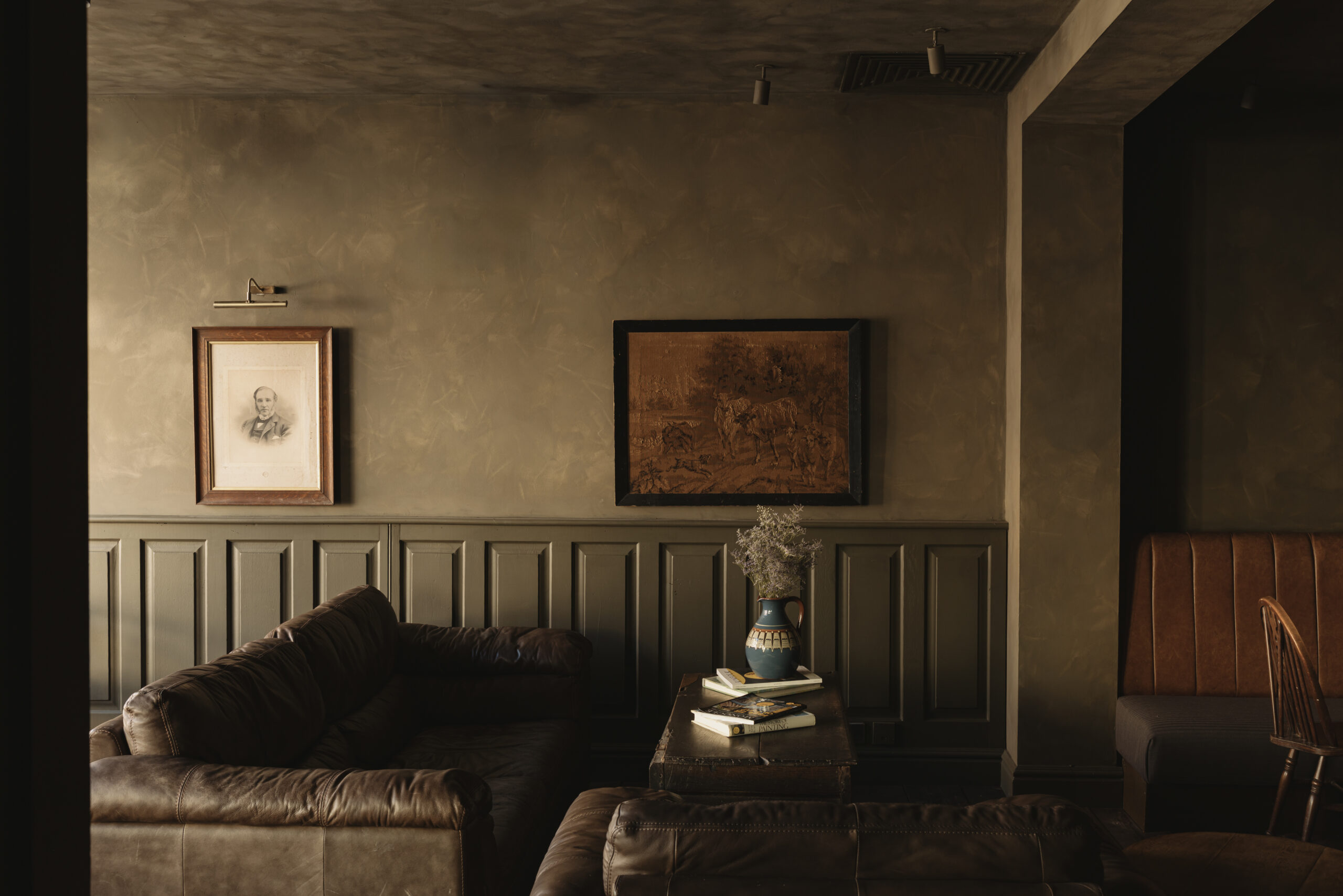 To the front of the building, we used a custom mineral paint on walls and ceilings to create texture and depth. We ripped up the beer-soaked carpet, and replaced it with burnt scaffolding boards. Sitting on top of this is a collection of antique furniture from around Scotland. The lighting is low, the seats are comfy – a happy coffee spot by day, which transitions into a great place for Guinness as the hours while away.