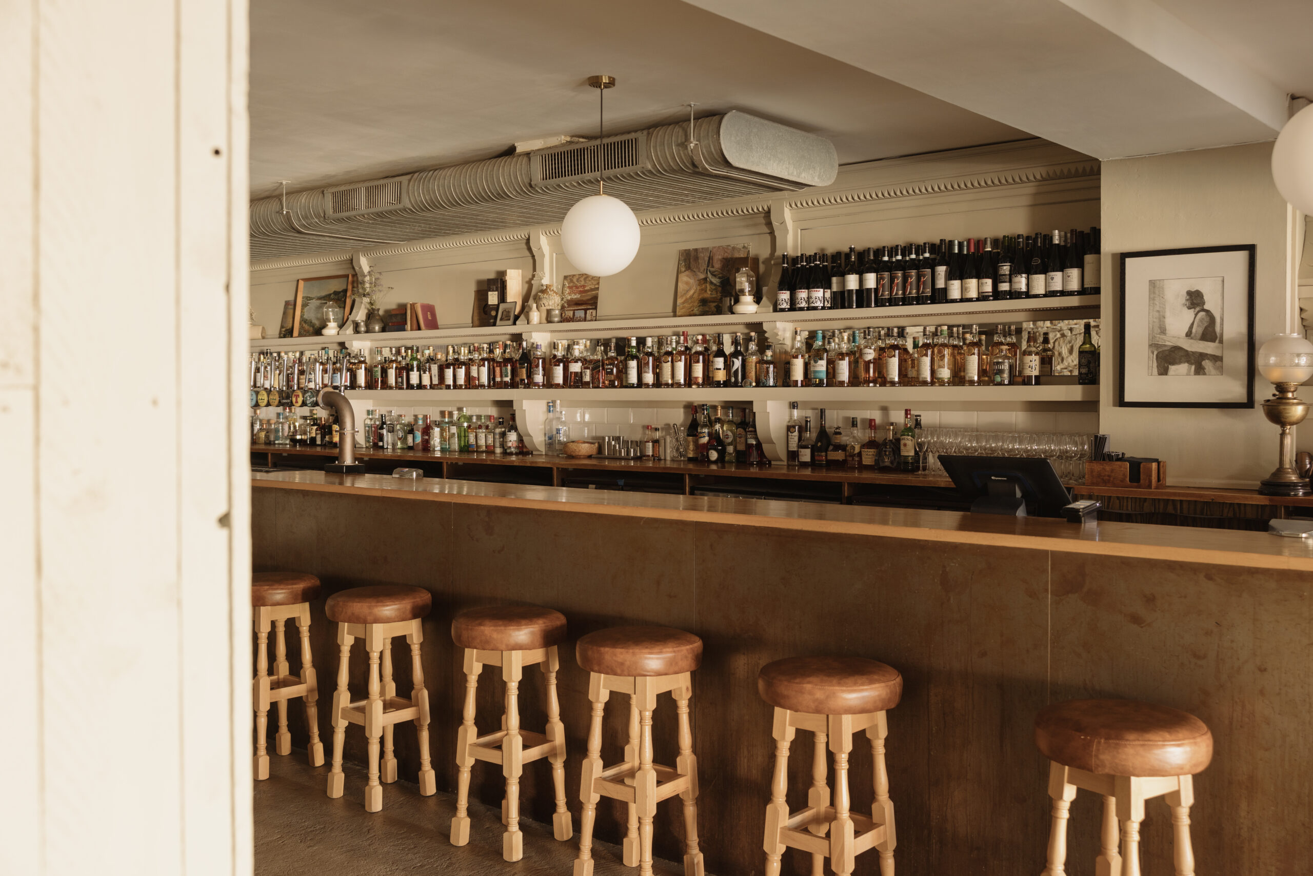 Moving from the dark and cosy front room, the bar opens up with off-white and an exposed sandstone wall, each playing host to more contemporary pieces of art. The bar is stocked with more paintings, books, and nick-knacks. The brighter, lighter spaces makes for a super backdrop for bottles of wine or gins and tonic.